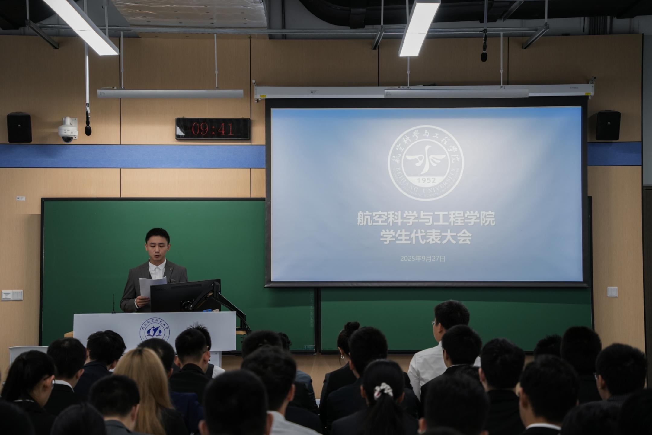 大会第一项,全体与会人起立,奏唱国歌,航空学院2025年学生代表大会在激昂的歌声中拉开帷幕。