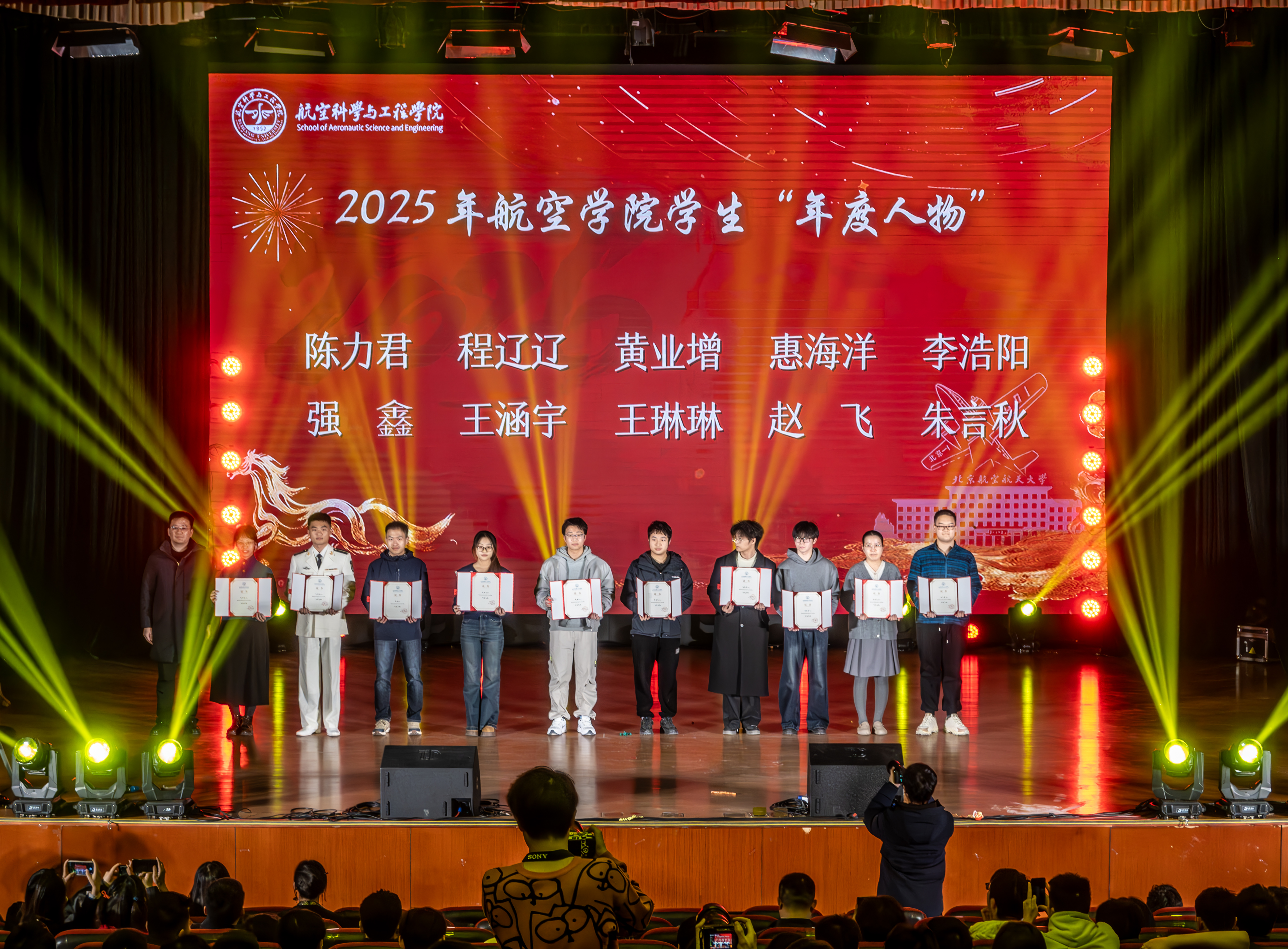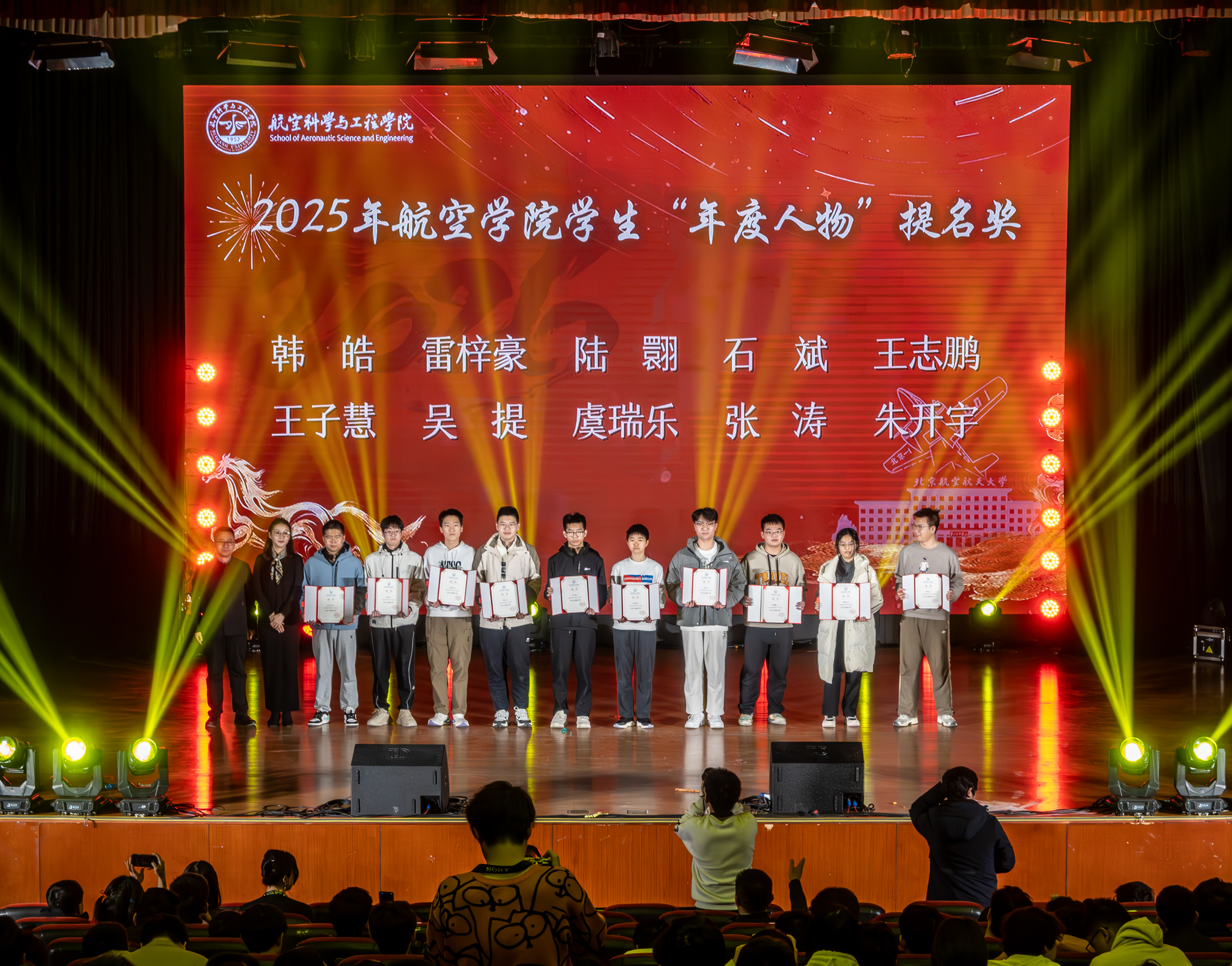 随后,学院举行了2025年学生荣誉表彰大会,集中总结并表彰了过去一年中在学生工作、学术科研、文体活动等方面取得突出成绩的学生团体与个人,学院党委书记董雷霆为获评航空学院2025年学生年度人物的同学颁奖,副院长彭博、罗明强为获得航空学院2025年学生年度人物提名奖的十名同学颁奖,勉励全体航空学子以优秀朋辈为榜样,将个人理想融入国家航空事业的宏伟蓝图。